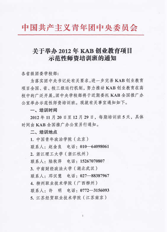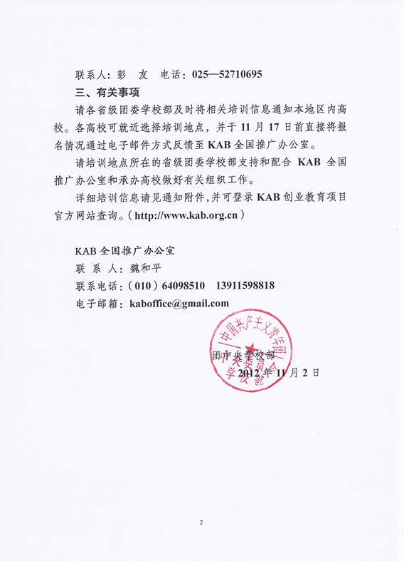 请各省级团委学校部及时将相关培训信息通知本地区内高校。各高校可就近选择培训地点,并于11月17日前直接将报名情况通过电子邮件方式反馈至KAB全国推广办公室。