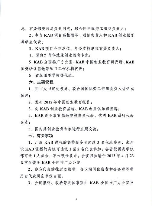 1.开设KAB课程的高校最多可选派3名代表参加,未开设KAB课程的高校可选派1至2名代表参加;各省级团委学校部可派1人参加,不作硬性要求。会议回执请于2013年4月23日前反馈至KAB全国推广办公室。