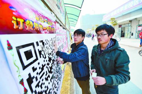 3月20日,网站团队成员赵跃(左)与陈高磊在校园内张贴网站的二维码广告。
