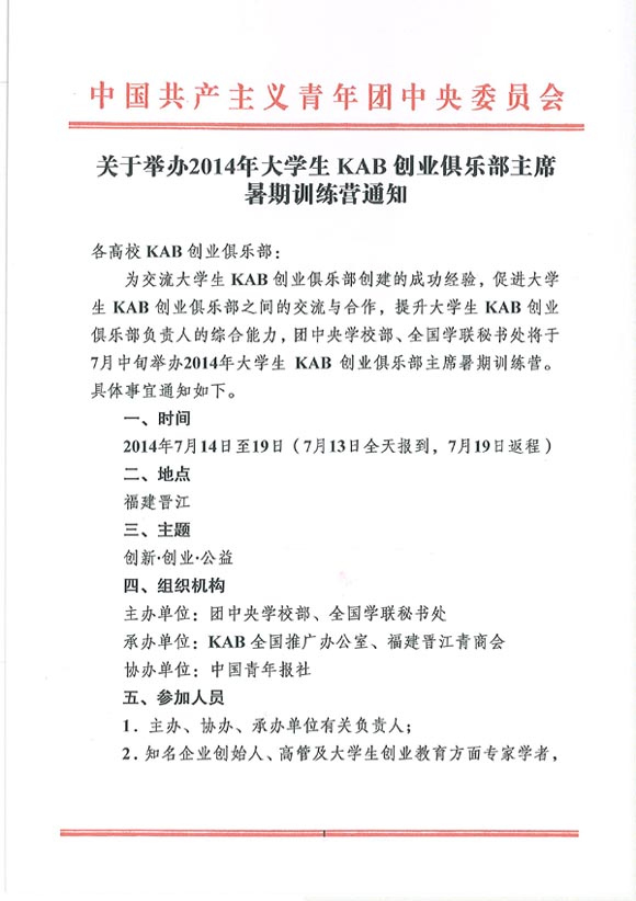 为交流大学生KAB创业俱乐部创建的成功经验,促进大学生KAB创业俱乐部之间的交流与合作,提升大学生KAB创业俱乐部负责人的综合能力,团中央学校部、全国学联秘书处将于7月中旬举办2014年大学生KAB创业俱乐部主席暑期训练营。具体事宜通知如下。