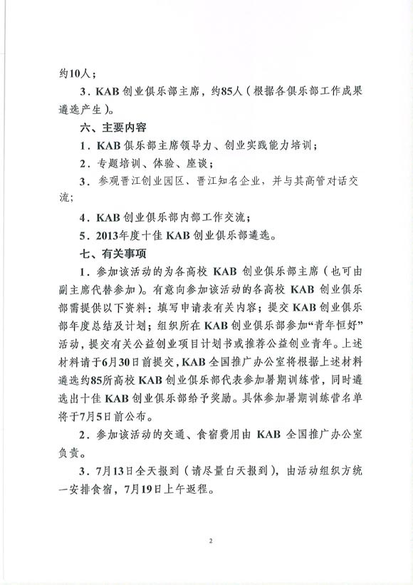 1.参加该活动的为各高校KAB创业俱乐部主席(也可由副主席代替参加)。有意向参加该活动的各高校KAB创业俱乐部需提供以下资料:填写申请表有关内容;提交KAB创业俱乐部年度总结及计划;组织所在KAB创业俱乐部参加“青年恒好”活动,提交有关公益创业项目计划书或推荐公益创业青年。上述材料请于6月30日前提交,KAB全国推广办公室将根据上述材料遴选约85所高校KAB创业俱乐部代表参加暑期训练营,同时遴选出十佳KAB创业俱乐部给予奖励。具体参加暑期训练营名单将于7月5日前公布。
