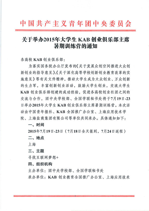 为落实国务院办公厅发布的《关于发展众创空间推进大众创新创业的指导意见》、《关于深化高等学校创新创业教育改革的实施意见》等有关文件精神,推动大学生成为大众创业、万众创新的生力军,丰富创新创业活动,鼓励大学生创业,交流大学生KAB创业俱乐部创建的成功经验,促进各高校创业社团之间的交流与合作,团中央学校部、全国学联秘书处将于7月19日-23日举办2015年大学生KAB创业俱乐部主席暑期训练营。本次活动由中国青年报社、KAB全国推广办公室、上海应用技术学院、上海盐商集团有限公司等单位共同承办。具体通知如下: