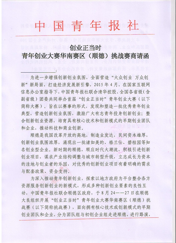 中青在线讯(李中华)为进一步服务青年创新创业,全面融入“大众创业、万众创新”,探索以地方政府为依托的全国青年创新创业资源平台,由中国青年报·中青在线、共青团广东省委、清华控股、顺德区政府共同主办的“创业正当时”青年创业大赛华南赛区(顺德)挑战赛,将于2015年8月24日-27日在顺德大良举办,90支创业团队首次亮相华南赛区。