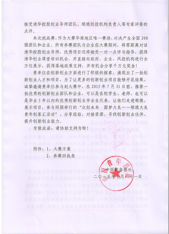 有志于对接资源,提升创业能力的优秀青年创业团队,请在7月31日之前登陆中青在线“青清创”频道,下载参赛回执,填写完整发到活动邮箱[email protected]正式报名。届时,90支创业团队近200位青年创业人才相约顺德,展示项目、分享经验、对接资源,寻找创新创业伙伴,提升创新创业能力。