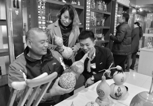 12月7日,在新华区残疾人创客工坊创业孵化基地,残疾人贾英立正在为客户讲解葫芦烫画作品。该基地成立2个月来,已经有11名残疾人在这里进行烙画、面塑、皮画等项目的手工创业,基地的工作人员还将免费为他们开展网络销售、产品推介、政策培训等活动,帮助残疾人实现他们的创业梦想。