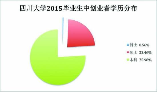 位于西部的四川大学毕业生创业比例较高。在该校2015届16049名毕业生中,自主创业毕业生合计179人。其中本科136人,占75.98%,硕士42人,23.46%,博士1人,0.56%。暂未就业的人群中有2.1%的人准备创业,为10人。