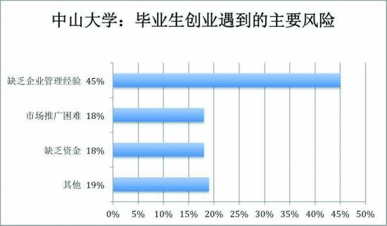 中山大学的报告显示,在对该校毕业生创业原因的调查中,有59%的人表示“理想就是成为创业者”。毕业生在创业过程中遇到的主要风险因素是“缺乏企业管理经验”(45%)、“缺少资金”(18%)、“市场推广困难”(18%)。
