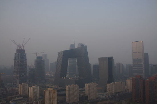 3月31日,北京气温飙升,浮尘相伴。雾霾浮尘下的中央电视台新址大楼。视觉中国供图