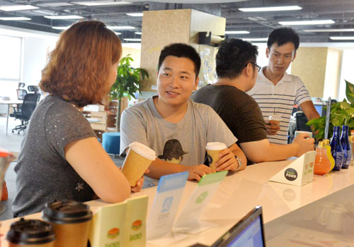 7月11日,在北大中电石家庄科技园众创空间,青年创客与客户进行业务洽谈。近年来,河北省石家庄市通过资金补贴、政策扶持等形式,建成50余家众创空间,免费为创业团队和公司提供创业指导、政策帮扶、资金对接等服务,帮助创客们尽快实现创业的梦想。