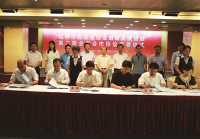 2016年7月18日,江苏省财政厅与工行江苏分行签订“小微创业贷”第二期合作总协议,苏州、常州、徐州、连云港、淮安、盐城、镇江、泰州等八个地区的市级财政部门、工行市级分行签订操作层面的合作分协议,实现“小微创业贷”业务省内全覆盖。图为签约现场。
