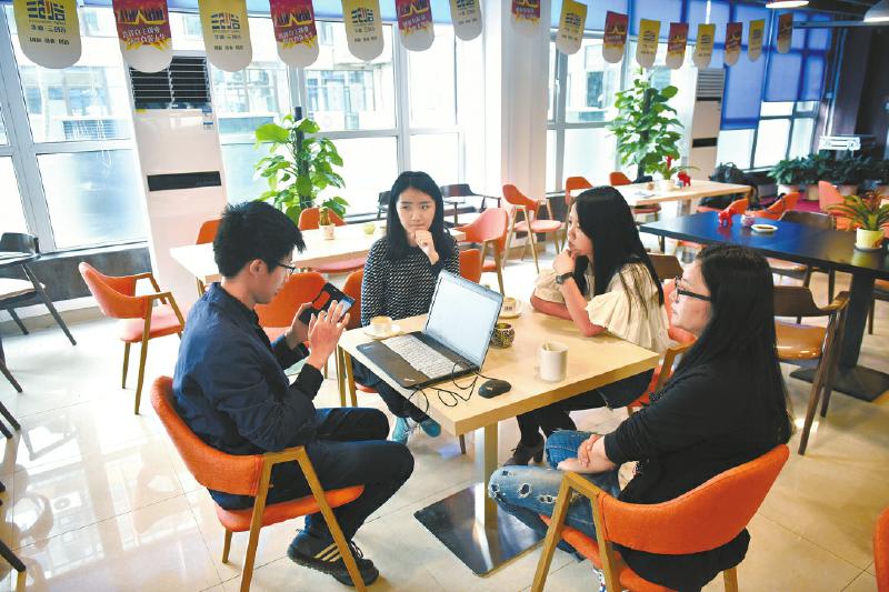川师大二学生李金泽(左二)每个星期都要坐3个小时的公交车过来找人喝咖啡聊创业,希望思想得到碰撞。她和团队正在研发一款叫做“精灵在身边”的手游。