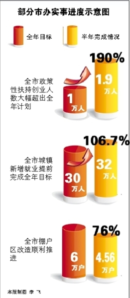 年初,围绕解决好市民最关心、最直接、最期盼的事情,市政府筛选确定了10件市办实事。截至6月底,10件市办实事总体进展顺利。其中,城镇新增就业、政策性扶持创业、提高居民大病医疗保险待遇、公共交通换乘优惠、60-64周岁老年人半价乘坐公交车、低保提标、实施新的城乡居民医疗救助制度等多项工作已提前或超额完成年度目标。