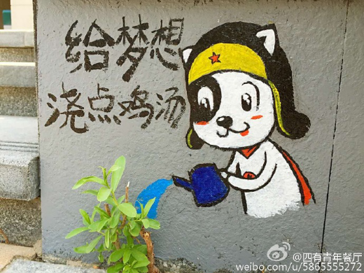 “很早以前,我就发现餐厅门外的石板路上长了个一棵小树苗,它经历了风吹、日晒、雨淋,直到我们餐厅正式开业还在强悍的生长着。于是我们在旁边画了一个小小的标示,写上‘给梦想浇点鸡汤’。在我眼里,这棵小树就像无数创业者一样,明知前路险恶,却依旧执着。”