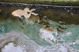 近日,记者来到徐晓磊设在李岙的石蛙繁育场。5个浅浅的水池里,一窝窝石蛙蝌蚪游动着,它们比青蛙的蝌蚪要大,黄褐色的体表夹着黑色条纹。另外一排房子是石蛙的繁殖场。掀开一块石棉瓦,底下顿时蹿出一群群身形壮硕的种蛙。小徐说,这些蝌蚪是今年四五月间孵出来的,长势良好。野生的石蛙皮肤上带有蚂蟥卵,需暂养半年完全“排毒”之后才能交配,喜欢潮湿、黑暗的环境,必须是干净的活水,生长、繁育条件十分苛刻。