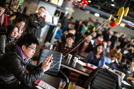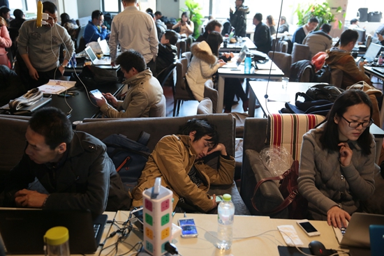 2015年1月29日,大批正在创业的年轻人聚集在北京车库咖啡,这里更像是个大学食堂或者是网吧。视觉中国供图