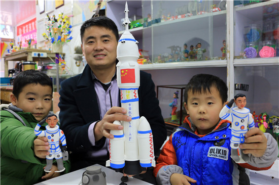 11月19日,山东省邹城市民间面塑艺人孙艳斗和孩子们展示面塑“神舟十一号”及“宇航员”“返回舱”作品。王齐胜/摄视觉中国供图