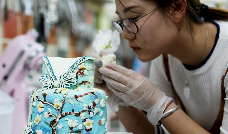 在山东省威海市韩乐坊商业街有一家名为“浆果”的蛋糕店,该店出售的宛如艺术品的蛋糕受到顾客青睐。这家蛋糕店的店主赵玲艺是位90后女孩,2015年她从山东大学艺术学院美术学专业毕业后回到家乡威海创业。赵玲艺利用自己的油画专业特长,以奶油作“颜料”,根据客户的个性需求在蛋糕这个特殊的载体上“作画”,描绘着自己的创业梦想。新华社发(陈宏青 摄)