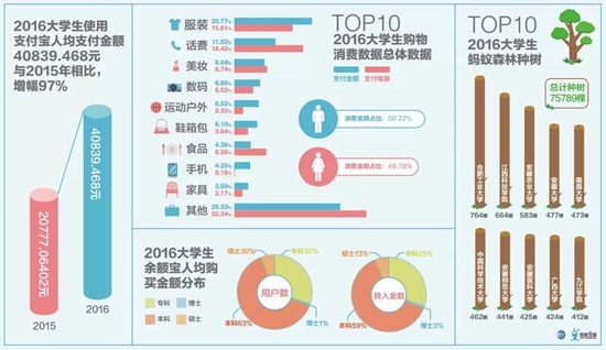 2017年1月,中国高校传媒联盟联合蚂蚁金服旗下支付宝,就全国4000多所高校及职业院校、1000多万在校大学生的消费数据进行了专门的梳理。这份账单涵盖购物、出行、理财、人际、公益等维度,同时细化了大学生关注的校际、性别、星座等方面的收支差异。