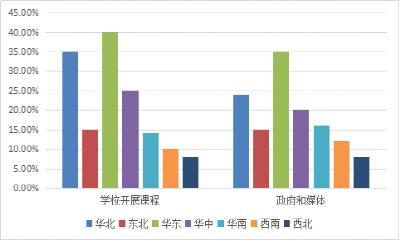 本次调研数据显示,青年公益创业项目涉及全国24个省份,调查显示,在华东、华北分布较多(如图1),受地区影响较大,主要原因在于创业教育的开展、政府和媒体的支持(如图2)。由于经济发展不平衡,华东、华北地区教育发展水平较高。经济水平较低的西部地区缺乏相应条件的支持,基础设施落后,不利的客观因素制约公益创业活动的开展。