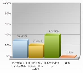 调研数据显示,33.43%的公益创业组织“已经注册成工商企业或民营非企业”,23.42%的项目“未注册法人单位”,“只是创业计划书未实施”的项目占42.34%(如图5)。与上年数据相比,“已注册的项目”比例增加10%,其主要原因在于政府简化办事程序,法律体系逐渐完善。我国在公益创业领域未形成完善的法律体系,没有明确规定公益创业组织表现形式。因此,公益创业形式多样,具体表现为福利企业、民办非企业、社团、公司、合作社、互助组织、社区服务组织等形式,或者没有获得合法身份单位的草根组织(如图6)。具有成功商业模式运营的代表性社会企业数量较少,多数由于缺乏启动资金且产品和服务处于试验阶段,多停留在项目计划书层面。
