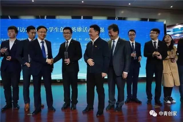 共青团中央书记处书记傅振邦、全国大学生创新创业联盟理事长刘庆峰和广发证券党群工作部执行董事李晓武为获得“寻访2016年大学生创业英雄”十强代表颁奖